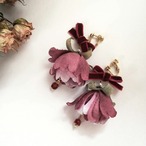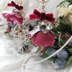 架空のお花を作ってみたくて、今回は不思議の国のアリスのハートの女王をモチーフに布花を作りました。ハート型の花びらは中心に行くほど白くなるグラデーションにしました。金の縁取りがついたチェコビーズはチェーンでつないでゆらゆら揺れます。いろんなリボンを合わせてみたけど、やっぱりベロアリボンが一番クラシカルでカワイイ!
