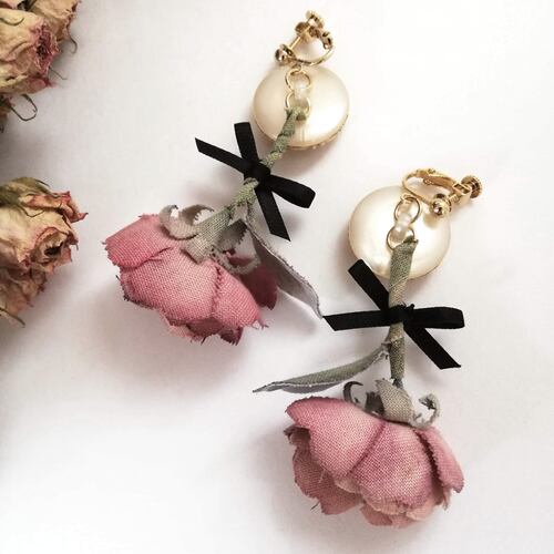 パールボタンと薔薇のアンティーク風イヤリング