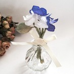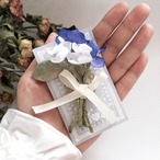 何度も色を重ね、深みのあるさわやかな青に染めた花と、白い小さな花をまとめ、
