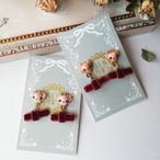 今まですごく大振りなイヤリングが多かったので、ちょっと小さ目のものを作ろうと思ったのと、どうぶつのお顔とリボンを組み合わせたものが作りたいな~と思っていたところが組み合わさってこのイヤリングができました。