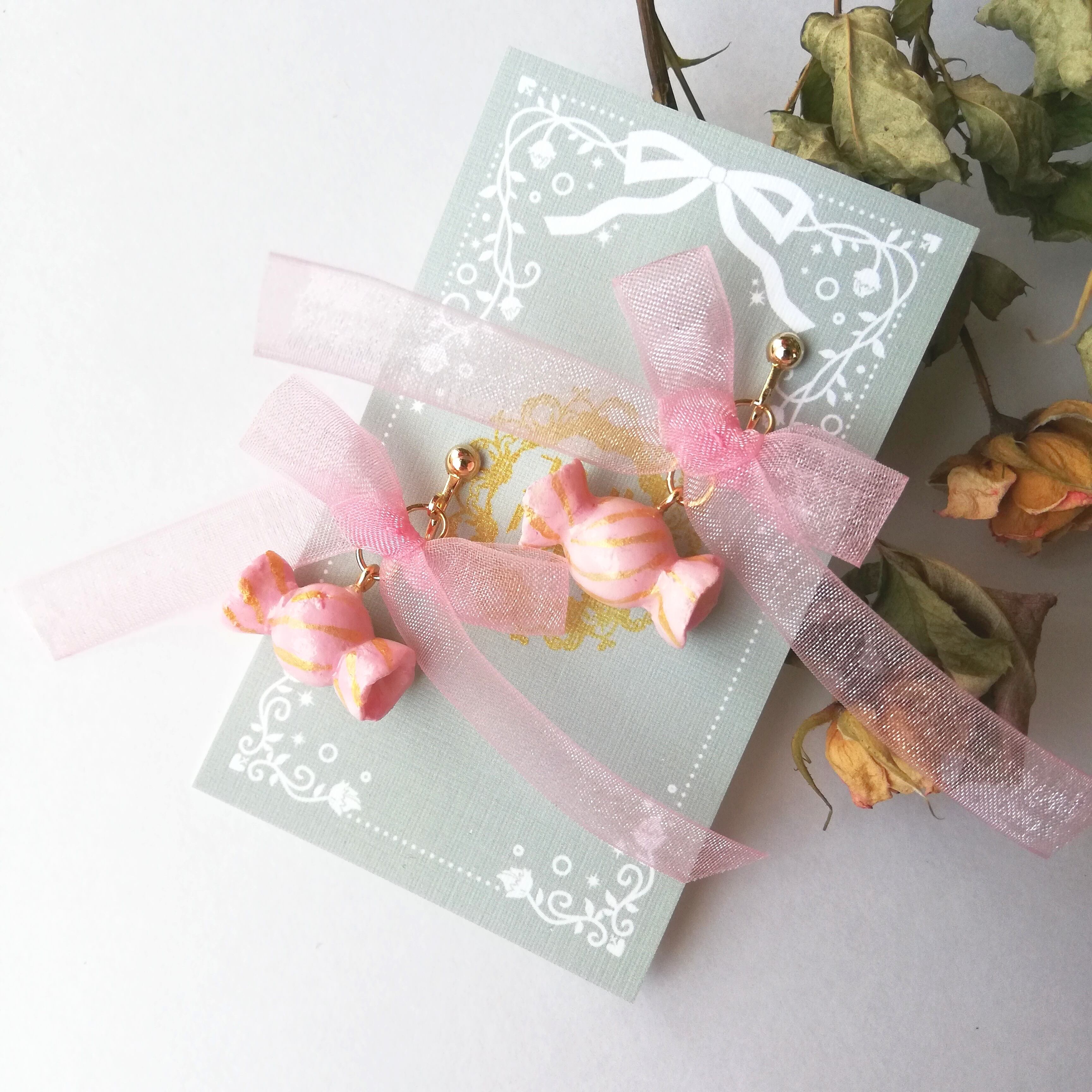 樹脂粘土で手作りしたキャンディとリボンを組み合わせたアクセサリーです。